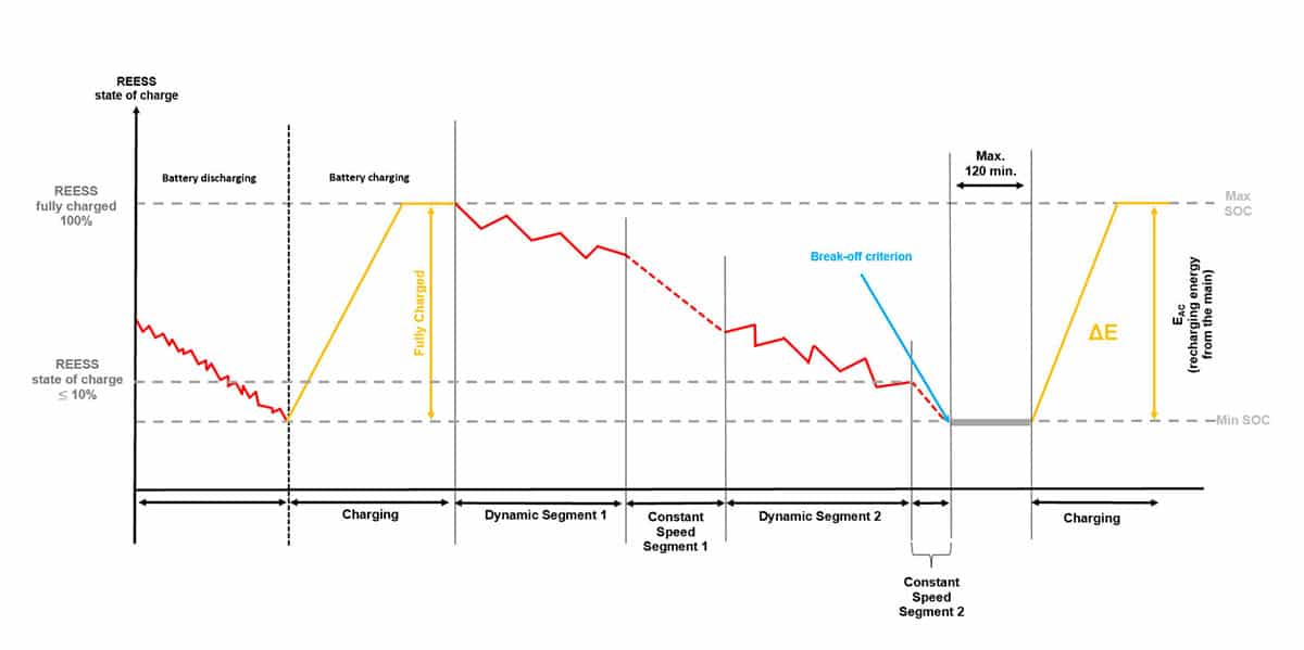 La première phase est réalisée avec une batterie pleine. Cette dernière est donc un peu plus froide que lors de la seconde phase dynamique, mais rend aussi indisponible la récupération d’énergie. La consommation est donc un peu plus importante sur cette première section. Le véhicule est ensuite lancé à une vitesse constante de 100 km/h afin de vider plus rapidement la batterie et de raccourcir la procédure d’homologation. Cette section à vitesse constante, dont la durée dépend de la capacité de la batterie, est celle qui emmène aussi la voiture jusqu’à un taux de charge de 0 %. Elle est ensuite gardée au repos au maximum pendant 2 h 00. La voiture est ensuite rechargée jusqu’à 100 % via courant alternatif, permettant de définir la quantité d’énergie injectée dans la batterie ainsi que les pertes.