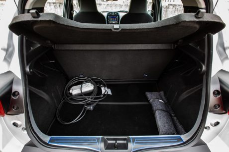Au niveau du coffre, la Spring offre un volume de 270 l pouvant être porté à 620 l une fois la banquette rabattue. Si la modularité n’est pas aussi bonne que la Twingo avec une banquette ne se rabattant que d’un seul tenant, le coffre est plus profond, un double fond permettant de loger une vraie roue de secours et d’y ranger les câbles de la charge.