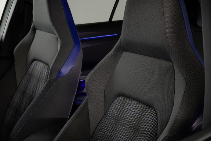 La déclinaison Golf GTE se remarque par sa prise d’air. Plus hypertrophiée et à grille alvéolée, elle est aussi plus agressive avec ses déflecteurs noirs. Ailleurs, un liseré bleu surligne le regard, le logotype « GTE » s’inscrit à gauche de la calandre, tandis qu’elle chausse des jantes spécifiques.