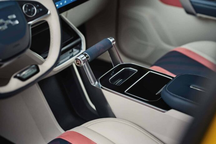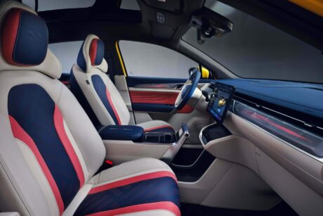 Pour personnaliser l’intérieur de votre choix, l’habitacle de ce SUV familial coupé sera spacieux et lumineux, grâce au grand toit panoramique en verre de 2,1 m² conçu par Saint-Gobain Glass. Ce dernier est à la fois beau, ouvert et contemporain, et contribue à maximiser la garde au toit grâce à sa finesse. Les sièges avant comme arrière sont confortables et offrent un excellent espace pour les jambes et la tête. Côté technologie, l’interface est dotée d’un écran principal de 14,6 pouces, qui contrôle les fonctions principales, les ouvrants, l’éclairage d’ambiance, le système audio (comprenant 11 haut-parleurs signés Magnat) et autres. Le tout fonctionne avec une fluidité et une réactivité remarquables. Enfin, le conducteur dispose d’un combiné tout aussi complet de 8,2 pouces. En somme, l’ensemble est très moderne et haut de gamme, comparable à un Tesla Model Y, mais avec une ambiance plus chaleureuse.